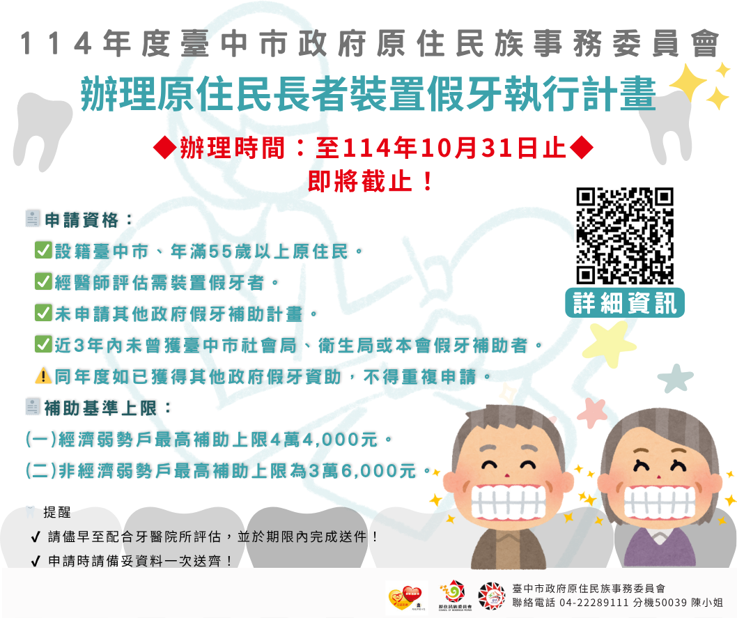 - 【重要訊息】114年度臺中市政府原住民族事務委員會辦理補助55歲以上原住民長者裝置假牙執行計畫
