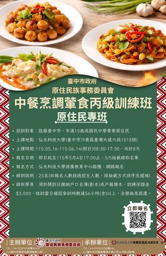 【重要訊息】115年度中餐烹調葷食丙級訓練班-原住民專班,開始報名!! 臺中市政府原住民族事務委員會 2026-04-09 一、 報名日期:即日起至115年5月4日下午5時止, 5月5日抽籤錄取名單。 二、 訓練對象:以設籍臺中市,年滿15歲或國民中學畢業原住民,有無任何烹飪經驗皆可參加。 三、 上課時間: 115年5月16日至115年6月14日(假日)上午8時30分至下午5時30分,共計8天。 四、 上課地點:弘光科技大學(臺中市沙鹿區臺灣大道六段1018號) 五、 報名方式:民眾可臨櫃於弘光科技大學推廣教育中心或於...