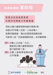 因此,為利防疫期間社區召開區分所有權人會議需求,都發局特別製作區權會召開指引,用4招輕鬆解決,分別是區權會配合防疫變更開會進行方式,工作與財務報告提供區權人書審;社區「分棟分區」分處報到、以投票方式決議與選任委員;計票過程配戴口罩、手套,會議結束須全面消毒;逾管委會任期,區權人可互推1人為召集人,再依前3招快速、避免群聚討論的方式召開區權會議,協助社區組織運作順暢。
