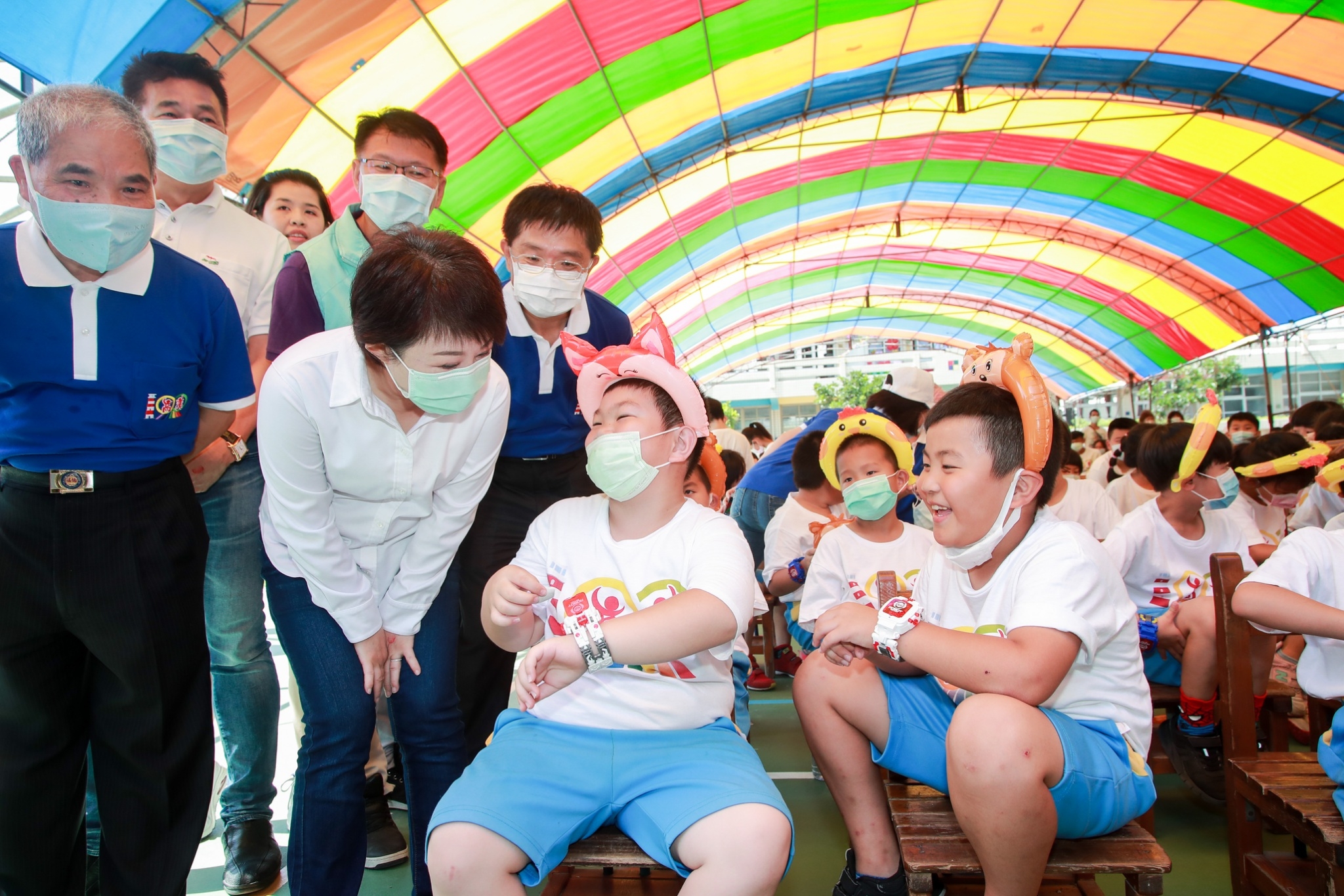 盧市長提到,去年市府特別撥預算為學校整修PU跑道,所有材質皆從歐洲進口,完工後的彩虹跑道已成為熱門打卡景點;未來市府會投入更多預算,讓學校環境更優良,期許各級師生以學校為榮,高美國小也將以學生為榮。