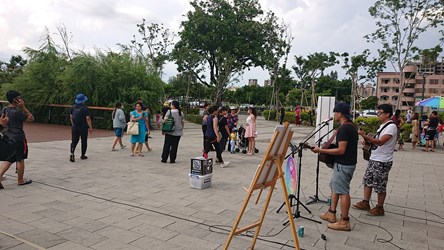 「街藝相挺 藝起加油」今晚在帝國糖廠正式揭開序幕,由在地街頭藝人河堤樂團及孔令嵩率先上場,文化局副局長施純福也到場支持,精彩的表演伴隨帝國糖廠生態池的夕陽美景,陪大家度過一個愉快的周末夜晚。