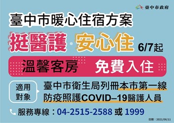 盧市長今日下午主持台中市流行疫情指揮中心線上記者會表示,第一線醫護人員照顧COVID-19病患相當辛苦,因擔心傳染風險有家歸不得,為體恤醫護人員防疫辛勞,市府自6月7日起媒合旅宿業者成立「醫護暖心住宿」專案,讓符合資格的台中醫護人員免費入住,「醫護守護台中,我們守護醫護!」