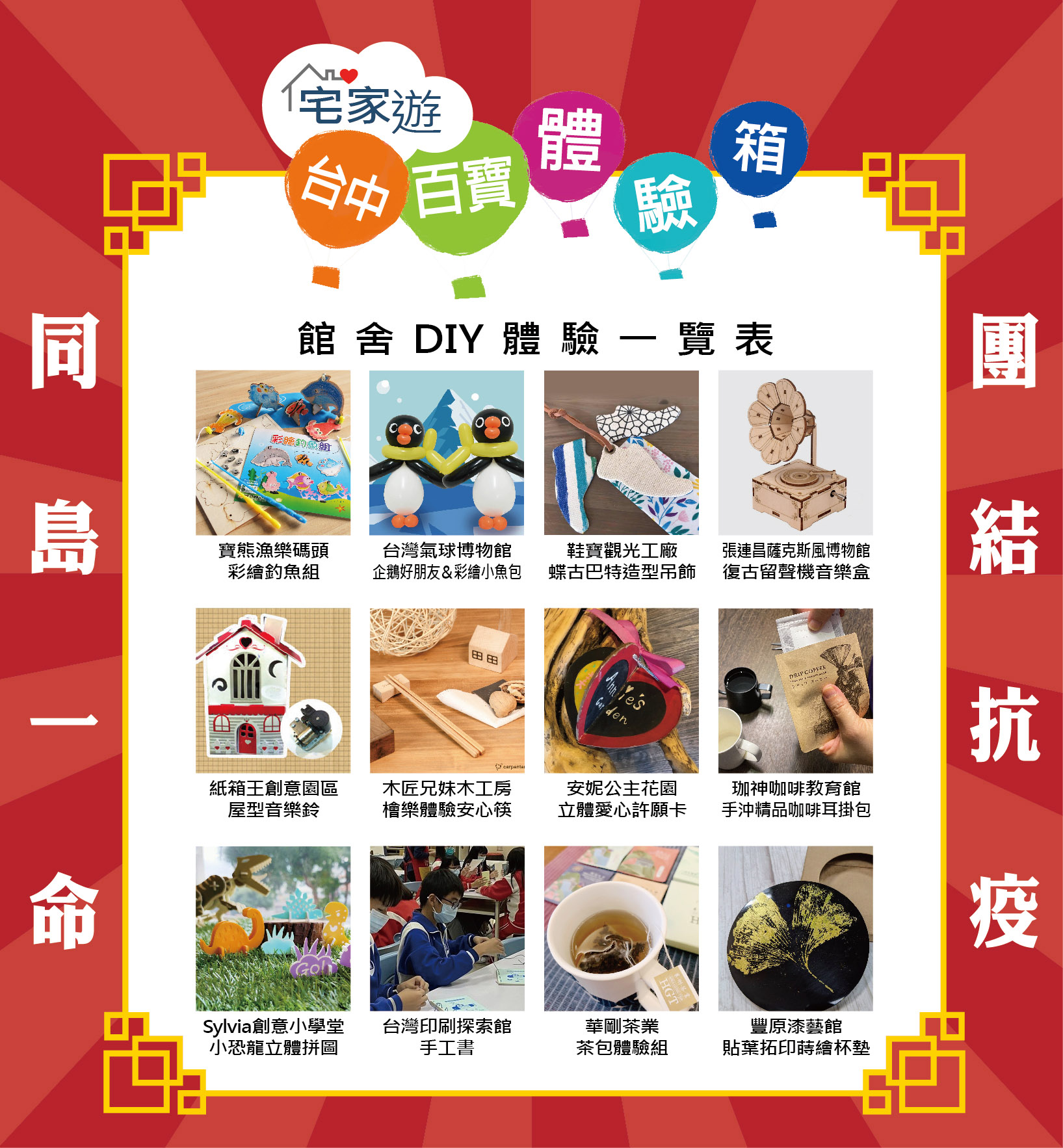 全國疫情三級警戒,重創觀光產業,為緩解產業負擔,台中市政府觀光旅遊局盤點觀光資源,與台中產業故事館發展協會合作,整合觀光工廠、創意生活與地方文化館等業者,並媒合線上電商平台在疫情期間推出「宅家遊台中--百寶體驗箱」,將在地體驗打包搬到家中,讓家長和孩子在家也能一起暢遊台中特色產業館,體驗各項手作DIY樂趣。