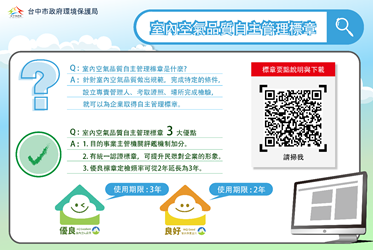 環保局指出,凡申請公私場所之自主管理標章,應營造優質室內空氣品質,以執行維護管理計畫,並委請環保署認可之檢驗測定機構,依「公告場所室內空氣品質檢驗測定管理辦法」進行檢測後,如符合標章推動作業要點規定,經環保局審查同意後,將授予標章使用權,並可張貼標章於場所出入口,提高企業品牌形象。