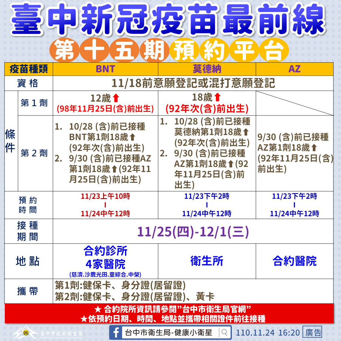 1922預約平台第15期新冠疫苗今(25)日起接種,AZ疫苗於各醫院施打,莫德納疫苗則由30家衛生所開診服務,BNT疫苗則於慈濟、沙鹿光田、童綜合及台中榮總等院所及合約診所接種,已完成預約民眾請依時前往接種;若未於平台預約,台中市政府衛生局也已媒合台中榮總、中國附醫及中山附醫三大醫學中心及部立台中醫院,分流推出BNT、莫德納、AZ及高端疫苗施打服務,符合資格且有接種需求者,可直接洽醫院預約施打。