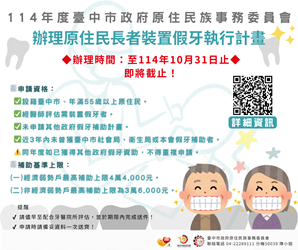 【重要訊息】114年度臺中市政府原住民族事務委員會辦理補助55歲以上原住民長者裝置假牙執行計畫