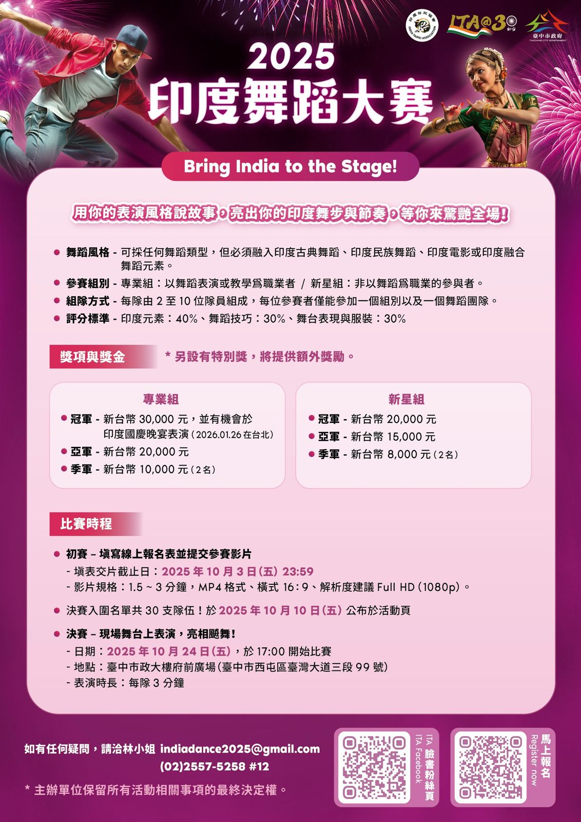 二、本年度適逢印度─台北協會在臺設立30週年,與本府於114年10月24日(星期五)在市政大樓府前廣場共同舉辦旨揭活動,包含印度舞蹈大賽與印度文化攤位,攤位內容涵蓋印度美食、舞蹈音樂、藝術等,期盼拉近雙邊社會,提高市民對印度文化的認識。報名與活動資訊如下: