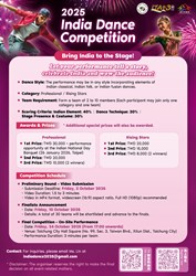 - 初賽以影片參賽,鼓勵跨界融合,將街舞、現代舞、甚至芭蕾等不同舞種與印度文化巧妙結合的獨特風格,只要作品中含有印度元素,皆歡迎踴躍報名,初審將選出最具潛力與創意的30組隊伍於10月24日下午5時在本府市政大樓府前廣場進行決賽,參賽辦法與最新宣傳資訊詳見「India Taipei Association-印度台北協會」臉書連結 https://www.facebook.com/ITATW。
