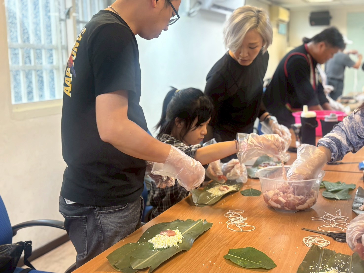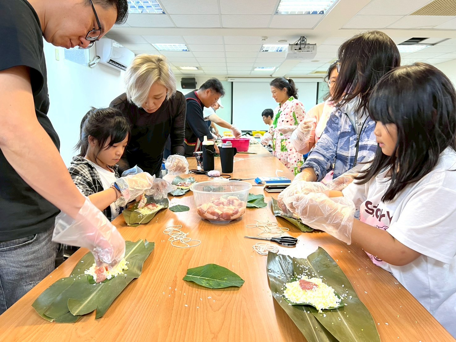 在傳統做法中,cinavu 會先以假酸漿葉包裹小米或糯米與豬肉餡料,外層再以月桃葉或五節芒葉層層包裹後綁緊,最後以蒸煮的方式烹調,香氣四溢,由於館內無法生火,活動特別安排讓大家體驗包製過程,並將完成的 cinavu 帶回家自行烹煮。