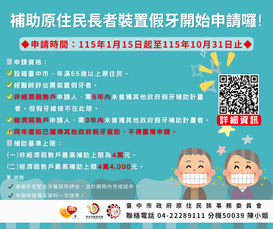 (一)設籍臺中市,年滿55歲以上之原住民,經牙醫師評估有缺牙且需裝置假牙者。