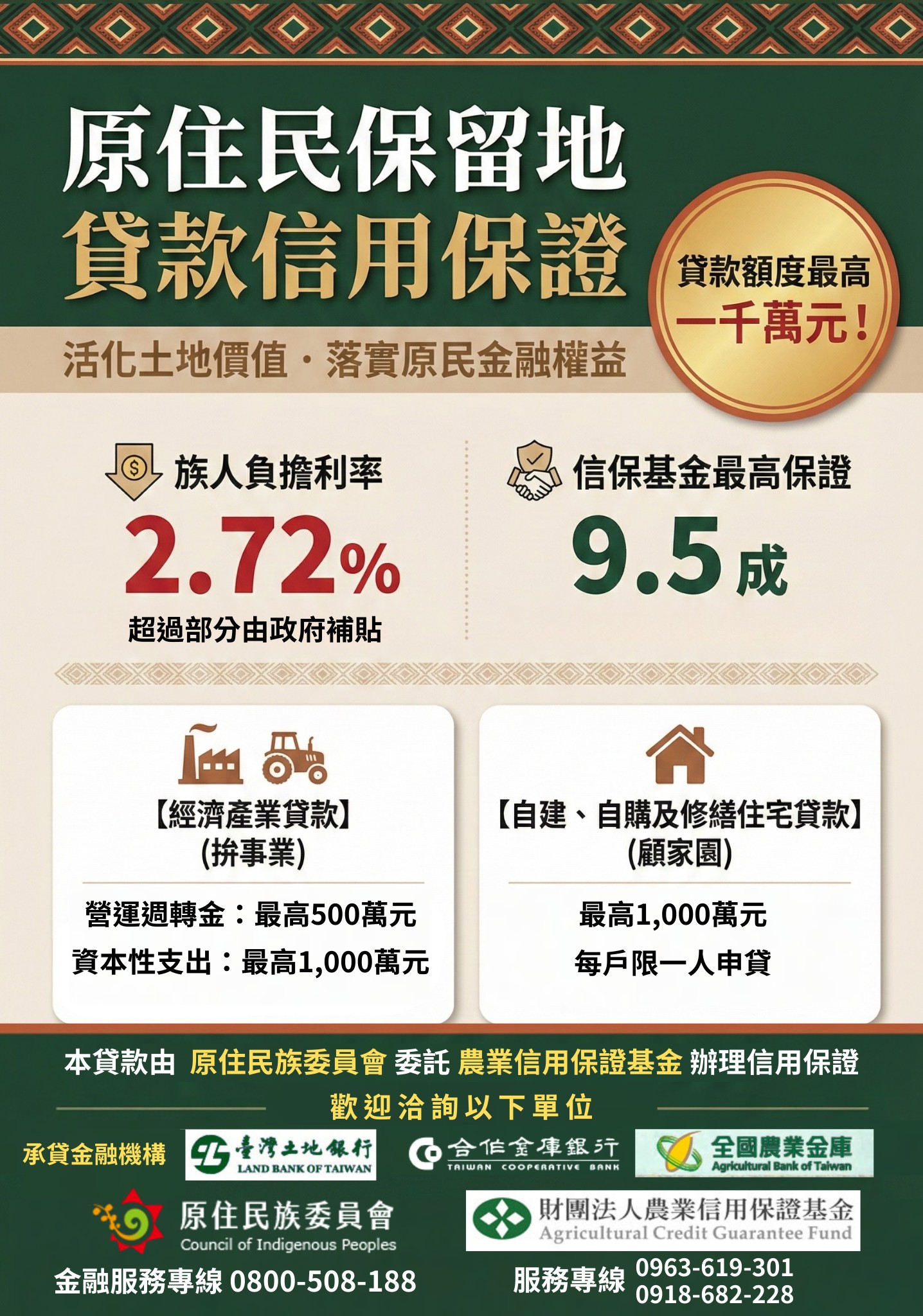 「原住民保留地貸款信用保證」將於115年1月16日起開始受理族人申請