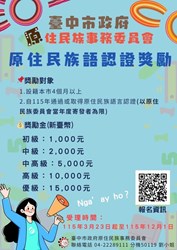 為推動原住民族語言之學習與傳承,依據「臺中市政府原住民族事務委員會原住民族語言能力認證獎勵金實施要點」,提供獎勵金予通過語言認證之市民,歡迎符合資格者踴躍申請!