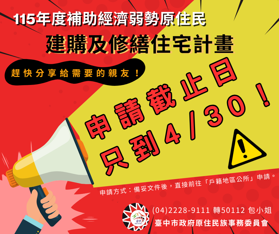 - 【重要訊息】臺中市115年原住民族紀念日活動 「saduu 看見原視界」影片徵選活動,歡迎報名~